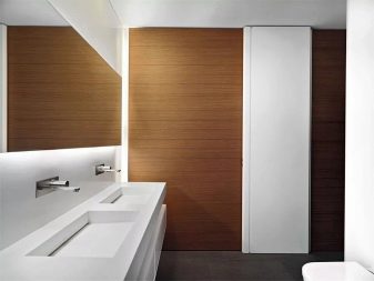 Zároveň se strom bojí vody a proto se s ním začíná hnit Je důležité používat impregnace na bázi olejů, vosku a dalších látek, které chrání před vlhkostí a odpuzují nečistoty. Pokládka stromu na podlahu, stejně jako na místa zdi, kde je velmi pravděpodobný kontakt s vodou, je stále nežádoucí, ale ve všech ostatních částech koupelny závisí trvanlivost opravy silně na tom, jak často je impregnace aktualizována.