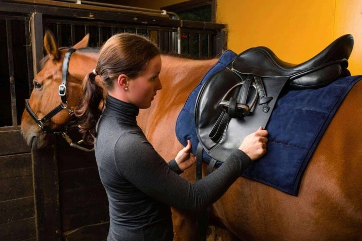 Poté se jezdec stane napravo od klisny a nastaví sedlo, počínaje shora dolů a jemně ho spouští. Na požadované úrovni jsou obvody sníženy. Postupně a přesně dotáhněte pásy a upevněte je z první díry. Po dosažení požadovaného stupně napětí jsou obvody pevné.