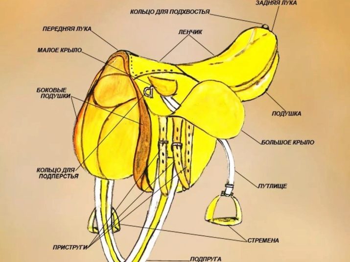 Základna (lenochka) je vyrobena z hustého materiálu a je jakýmsi rámem, ke kterému je připevněn zbytek sedla. Jako surovina pro to může být pružný plast nebo trvanlivé dřevo. Luky nazývají vyvýšené okraje sedla, nebo spíše jejich ohyby. Křídlo plní ochrannou roli a chrání nohy jezdce před odřením o opasky.