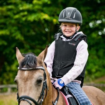 Toto je nejdůležitější vybavení a žádné dítě by nemělo jezdit na koni bez přilby. Doporučuje se také nosit, kdykoli je dítě blízko koně. Dětské modely jsou vyráběny v souladu s bezpečnostními normami.