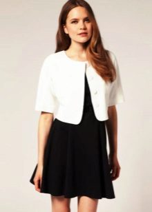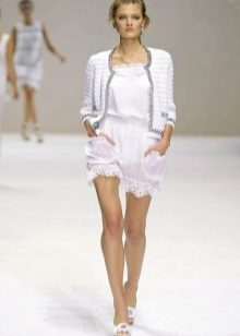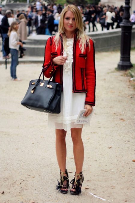 Celkový bílý vzhled pomůže vytvořit světle bílé šaty s volánkami a klasickou bundu se zipem. Dvě kapsy se zlatými knoflíky připomínají styl Chanel. Přidejte si na příď kovový náramek a boty na vysokém podpatku.