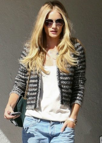 Pletená bunda v černé a bílé barvě s džíny vypadá velkolepě. Chcete-li dokončit vzhled, na stříbrný náramek a pás s krystaly. Váš neformální styl se tak stane elegantním.