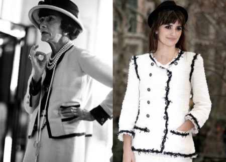 Knoflíky zlaté barvy s logem domu Chanel se stanou charakteristickou vlastností její bundy o něco později. Okraj ve formě pigtail podél okraje boku bundy Coco si ale půjčil od hotelového personálu.
