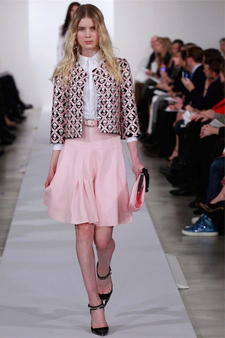 Romantický vzhled pomůže vytvořit růžovou bundu a klasickou černou sukni, jako je Natalia Vodianova. Boty s opaskovou smyčkou na silné patě a koženou kabelkou v béžové barvě budou perfektním doplňkem vašeho vzhledu.