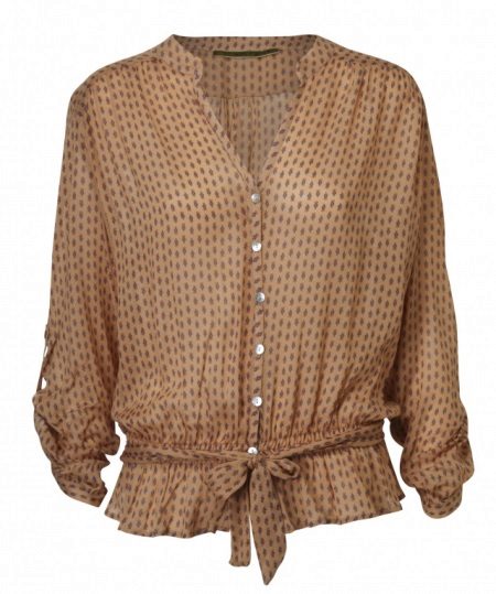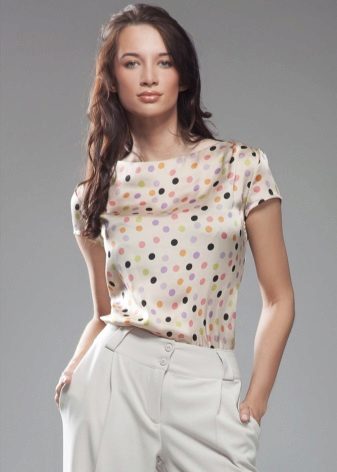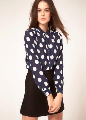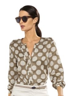 En bluse i store ærter ser spektakulær og fed ud. En sådan udskrivning vil hjælpe med at øge kvindelige former, så ejere af storslåede former ikke skal fylde deres garderobe med en sådan bluse.