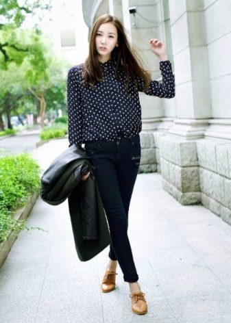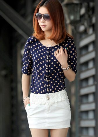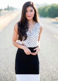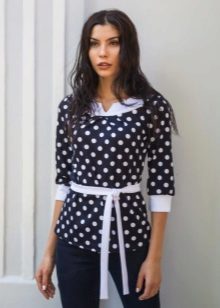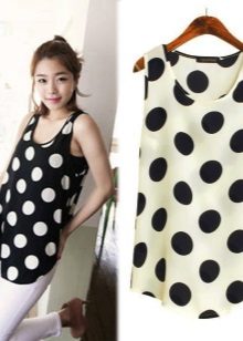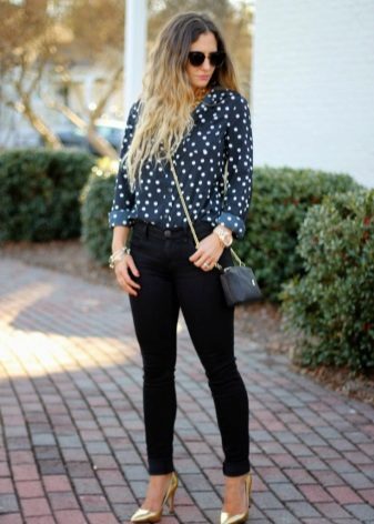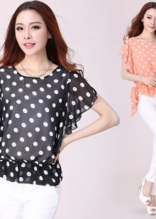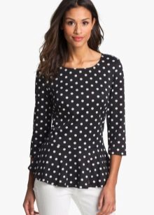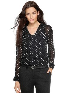 Den klassiske kombination af hvid og sort ser perfekt ud under alle omstændigheder. Hvide polka dot-bluser kan bæres med sorte tynde bukser. I dette udstyr kan du optræde på en fest, mødes med venner eller gå en tur.