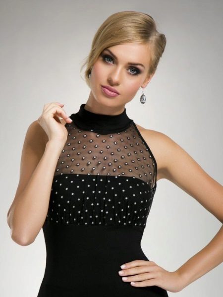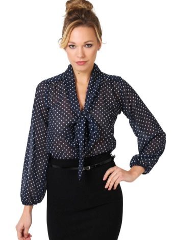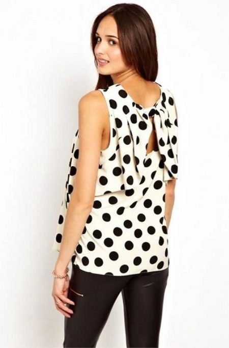 I dag er trenden polka dot-bluser med en åben halsudskæring på ryggen, med lange ærmer og en elegant bue i nakken. Denne model ser attraktiv og elegant ud.