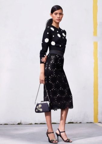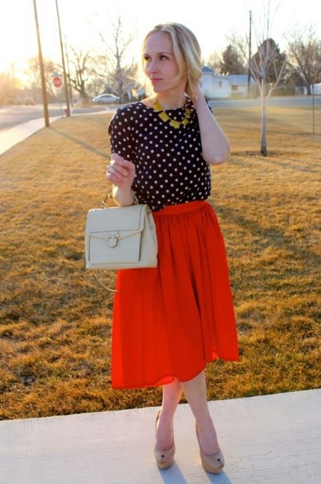 For at skabe et elegant og feminint look kan du bære en klassisk sort bluse med små hvide ærter i kombination med et orange knælængde nederdel. Det perfekte supplement ville være kaffefarvede stiletter og en rummelig taske med korte håndtag.