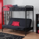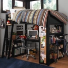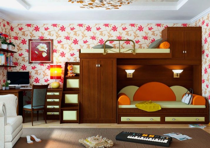 Kombinationen af en sofa og en seng i et børneværelse kan præsenteres og loftsstruktur. I dette tilfælde er et soveplads placeret i det øverste niveau, og sofaen er placeret nedenfor.Dog oftere, i stedet for en sofa på lavere niveau, organiseres en arbejdsplads. Bådens bredde er i dette tilfælde 80-90 centimeter, og længden går ikke ud over grænserne på 190-200 centimeter. Afstanden mellem lagene er 130 centimeter.