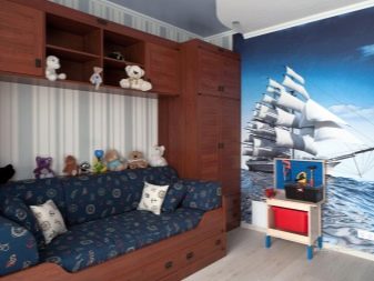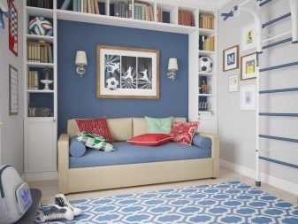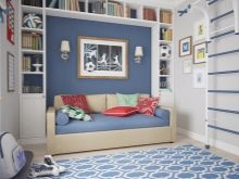 Det er bedre at tage sovesofa til drengen så kompakt som muligt, så der er nok plads til spil i rummet. Hvis barnet er interesseret i sport, kan du vælge en kortfattet model i avantgarde eller minimalistisk stil. Egnet polstring er lavet af linned eller bomuld og har en enkel, men lys farve, f.eks. Blå eller grøn.