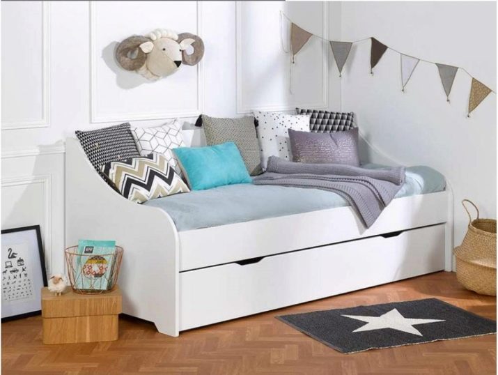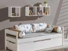 Der er mange indstillinger for rumdesign. For at designe en teenagers værelse i skandinavisk stil er en enkelt sovesofa med en hvid træramme ideel. Polstret er lavet i en neutral grå nuance, der gentager de dekorative elementer i rummet - en tekstil krans og et tæppe på gulvet. Selve den hvide ramme ser perfekt ud på baggrund af de samme hvide vægge og lys parket. Møblets design er sådan, at det om dagen bruges som en sofa, og om natten er det simpelthen dækket og brugt til at sove.