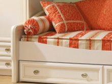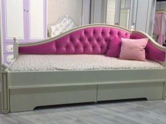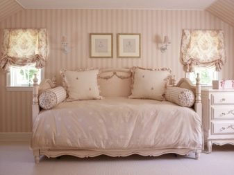 En sovesofa til en pige skal vælges i overensstemmelse med interiørets farveskema. Et romantisk barn vil nyde pastelfarver som lavendel, pulver eller oliven. Modellen vil se smuk ud i form af provencedekoreret med blomsterbeklædning og armlæn i trim. Optimale stoffer er bomuld eller linned.