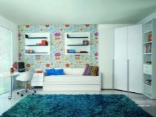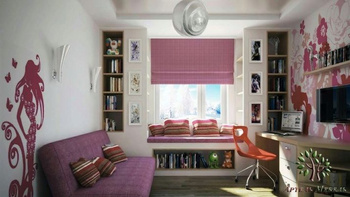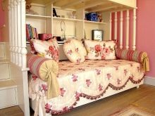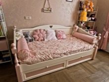 En sofa i en lys lilla skygge, også til stede i soveværelset med gardiner og tapet, passer perfekt ind i pigens soveværelse. Modellen er monteret tæt på væggen og tager ikke meget plads. Som dekoration bruges flere mønstrede puder i harmonisk matchende farver. Ulempen med denne sofa er manglen på sektioner til opbevaring af sengetøj.