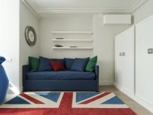 Et andet soveværelse ser ganske stilfuldt ud, dekoreret i skandinavisk stil, men designet specielt til en teenage dreng. På en snehvid baggrund af vægge og en lakonisk sort-hvid plakat fremtræder en mørkeblå transformer-sofa som et lyspunkt. Blødt polstring giver komfortabel brug af møbler til søvn og til afslapning om dagen med venner. Som udsmykning på sofaen er der flere puder, der skal matche.