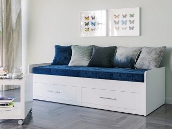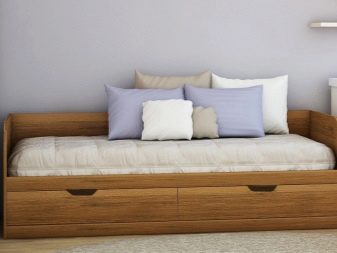 Som regel er bredden på sovesofa 80-90 centimeter, og længden varierer fra 180 til 200 centimeter. Antallet af skuffer kan være anderledes, men højden på glideafsnittene går ikke ud over grænserne på 30-45 centimeter.