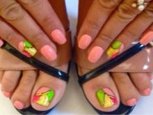 - Blomster, palmer, fugle. Forskellige blomsterkombinationer på lyse negle er præcis, hvad du har brug for en varm sommerferie. Det er ikke nødvendigt at dekorere alle tånegle med lyse tegninger. Som regel skiller en stor søm sig ud, og resten males med den samme farve eller ved hjælp af gradientteknikken.
