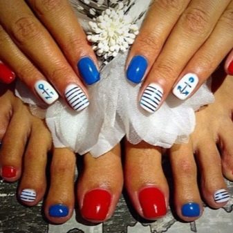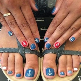 - Marine motiver. Manikyr og pedikyr, dekoreret i sådanne emner, ser meget rentable ud om sommeren. På neglene kan der tegnes klassiske striber ved hjælp af hvide, blå, røde og guldfarver. Selve roret kan også afbildes. Palmer, bølger, skaller og søstjerner - alt dette er gode ideer til at designe en lys sommermanikyr.