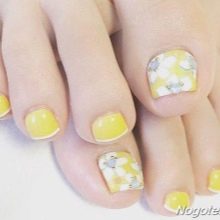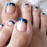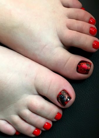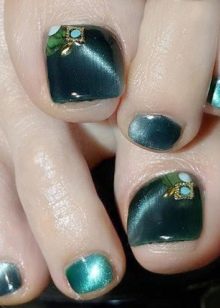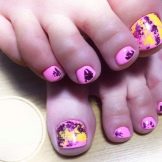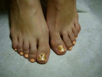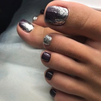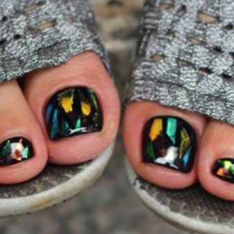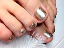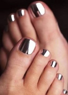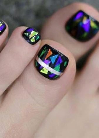 - Folie. I dag er denne specielle folieindretning en af tendenserne inden for pedikyredesign. Det kan være anderledes, hvilket giver en kvinde mulighed for at vælge en mulighed under hensyntagen til sine egne smagspræferencer. Denne indretning er perfekt kombineret med metalliske belægninger, og den kan også dekorere matgellakker. Foliens overløb kan være guld, sølv, det kan være en delvis indretning af neglepladerne i design af ”brudt glas”.
