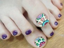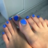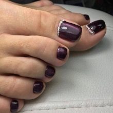 Blandt andre farver skiller vin og blå sig ud. Disse nuancer kan have forskellige farvekombinationer, afhængigt af det valgte design. Som regel blødgøres de ofte med hvid farve, hvilket bringer elegance til selv det enkleste design. Pedikyren ser smuk ud i kontrast til sorte og sølvfarver. Lige luksuriøst design af tåneglene med en lilla mat base og lille stase.
