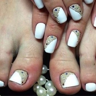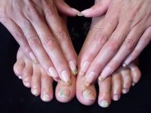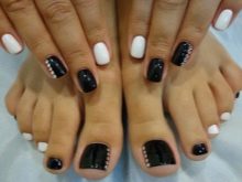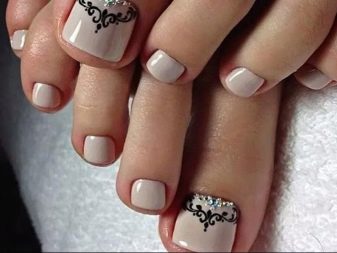 - Klassisk jakke med en nøgen nuance af gelpolering. Accentuering af de store tæer på begge ben med et mønster med rhinestones og sort kontrast.