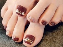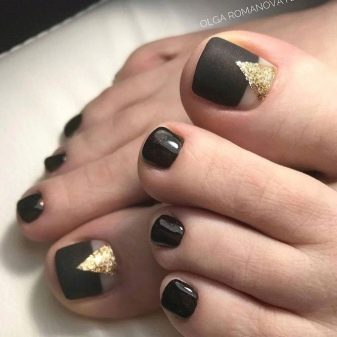 - en original kombination af farvetoner, et abstrakt mønster på accentnagler giver lysstyrke til en mørk base, glitter i stedet for rhinestones er mere praktisk, mens pedikyren ser stilig og frisk ud;