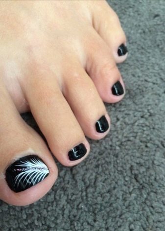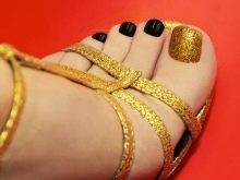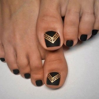 - Luksuriøs løsning med sort. Du har brug for en top med en mateffekt og færdiglavet indretning i form af klistermærker. Et græsk ornament med guldfarve på en tå dekorerer hele pedikyren bedre end hvis du ville dekorere hver tå med rhinestones.