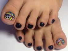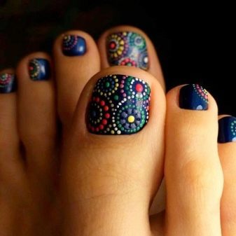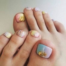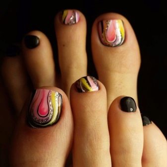 Når du vælger designindstillinger i flerfarvede nuancer, skal du overveje deres kompatibilitet med tonerne i det tøj, der er tilgængeligt i klædeskabet. Lys og mørk farve matcher ikke altid de lyse nuancer af sommerkjoler. Hvis mørke toner er grundlæggende, skal du støtte buen med et tilbehør i en lignende farve. Så pedikyren vil være passende, og billedet vil virke mere interessant.