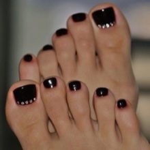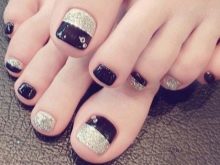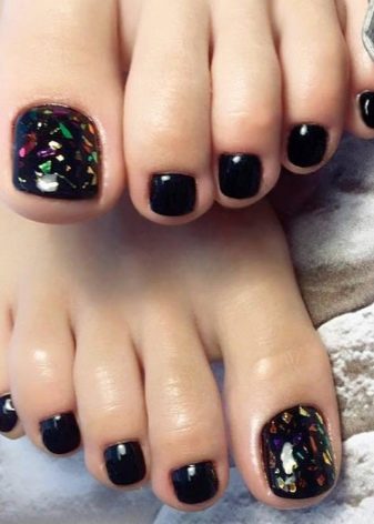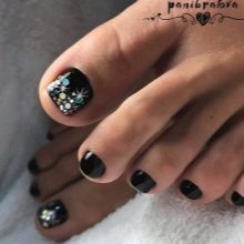 Nuancer af pastelfarver, deres bløde kontraster, kombinationen af to toner på grund af forskellig indretning er populære denne sæson. Modetrends og den sorte farve på pedikyren ignorerede ikke, i dag er den i centrum af opmærksomheden, hvilket tillader at understrege luksusen for det kvindelige billede gennem en stilfuld pedikyr med sølv, guldmønster eller rhinestones.