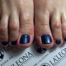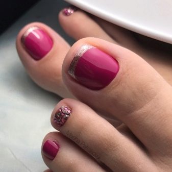 - Mængden af indretning har en tendens til et minimum. Ofte har endda en luksuriøs aftenpedicure kun små accenter på store tæer med en ensartet belægning af alle negleplader i en farve.