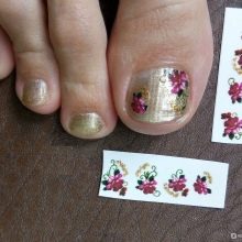 - Efter pigmentering dekoreres neglene ved hjælp af kamifubuki, klistermærker, folie, stempling eller rhinestones. Indretningen limes på topcoatlaget.