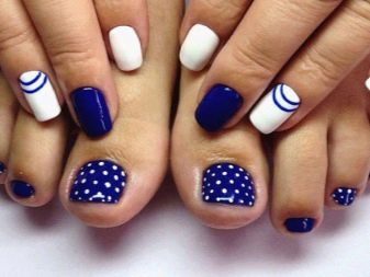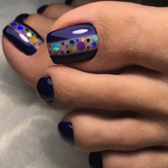 - Et sådant design er for alle. Alt, hvad der er nødvendigt i dette tilfælde, er at lave en enfarvet pedikyr og påføre et lille lag med pigmenteret gelpolver små hvide prikker på de accenterede tæer.