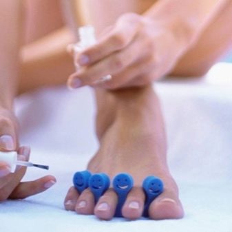 Du skal købe belægninger af høj kvalitet, fordi deres holdbarhed afhænger af dette. Derudover må vi ikke glemme: alle lag af pedikyren skal være tynde, ellers kan belægningen efter et par dage begynde at halde bag neglepladerne. Du kan ikke ignorere de særegenheder ved farve: hvis du vælger en skygge, der passer til huden, vil den ikke se smuk ud på små fingre uden dekoration. Den valgte tone skal mindst være lidt forskellig fra den naturlige hudfarve.