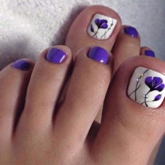 - Hver pedikyr i lilla farve med en hvid accent og blomstermotiv appellerer til enhver pige. Der er moderat brug af små rhinestones til dekorering af accent negleplader.