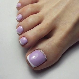 - elegant design i lilla toner med brug af klistermærker til accent tånegle og rhinestones for at understrege kutikulaområdet; blid kombination af kontraster;