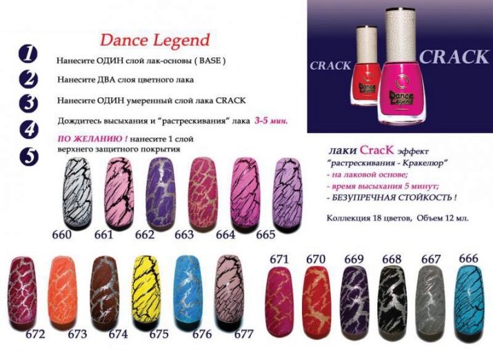 Craquelure gelpoleringsstoffer giver neglene effekten af slangeskind eller mosaik. Dette er en anden udvikling af dette brand, der har vundet popularitet blandt indenlandske fashionistas. Farverne her er for det meste mat, belægningen begynder at revne, når den tørrer. Ifølge anmeldelserne af sømtjenestemestrene trækker Dance Legend gelpoleringsmaterialer ikke fundamentet, når det revner, hvilket gør manikyren meget pæn. Ansøgning har sine egne nuancer. Først er neglen dækket med en beskyttende base, hvorpå lakken af den ønskede farve påføres. Det vil være synligt i de dannede revner. Når materialet tørrer, påføres craquelure-lak ovenpå. Efter tørring dækkes neglepladen med en top.