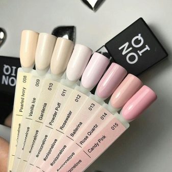 Oniq har designet en bred vifte af farver - fra naturlige naturlige farver til fransk manikyr til meget lyse og rige nuancer af rød, lyserød, lilla, mynte og andre farver. En sådan variation vil tilfredsstille smagen hos enhver fashionista. Til en festlig manikyr er lyse farver perfekte. Med garvet hud blandes fengende saftige nuancer smukt. Men til daglig manikyr er det bedre at vælge rolige og delikate nøgenfarver.