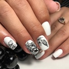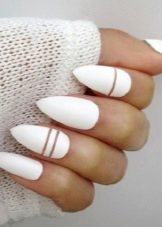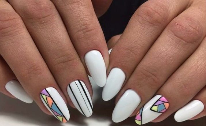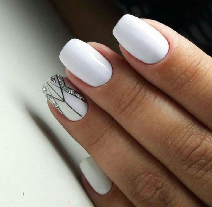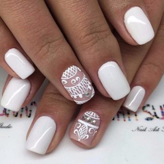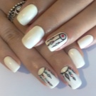 Megaactual på en hvid baggrund geometriske og skandinaviske ornamenter. Derudover inkluderer mode en manikyr-boho, der kan dekorere accent negle med en hvid bagside. Det er moderigtigt at dekorere negle med langstrakte trekanter, diagonale linjer og franske prikker.