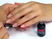 Hvid gel polish påføres forberedte negle. Først udfører de en hygiejnisk manikyr, idet de slipper af med neglebånd og overskydende hud, der vokser ind i neglen fra siderne. Det rengøres med en skubber og en saks eller en fræser. Efter at have formet kanten og justeret længden, skal neglen være poleret, passere langs dens overflade med en blød poleringsmiddel for forsigtigt at fjerne glansen.