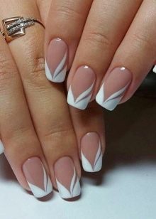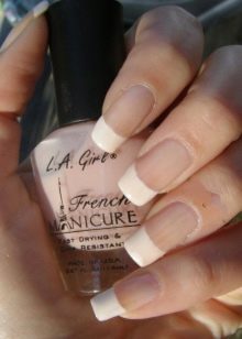 Fransk er en tidløs klassiker, der med rette indtager førstepladsen blandt fair sex. Beige lak påføres i et lille lag over den gennemsigtige base, og derefter trækkes et "smil" på spidserne af neglene i hvidt. For franskmændene kan du vælge nuancer fra de mest mættede til subtile.
