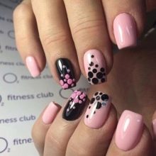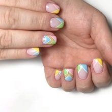 Hvis vi overvejer valget af farve set ud fra billedets generelle stilistiske retning, er der også små nye genstande. Først og fremmest vedrører de geometri. Negle i denne stil er et element i en romantisk og feminin bue. Derfor introduceres hele udvalget af strenge kontrastkombinationer af designere i en klassisk bue. Det anbefales at fortynde en sådan manikyr med rhinestones, paljetter og gnister.
