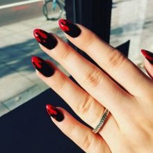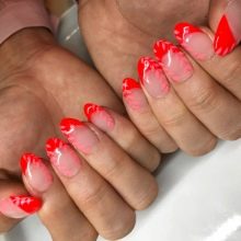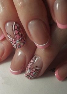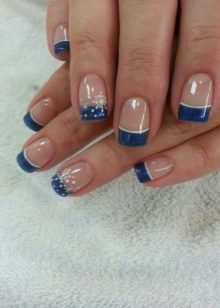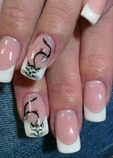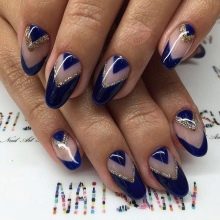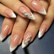 Og glem naturligvis ikke månemanikyren, som er optimalt kombineret med den franske stil. Det er ikke nødvendigt at følge den klassiske udførelsesteknik. Afrundingen i bunden af neglen kan erstattes med en trekant med kontrastfarve. Denne teknik i kombination med formen på neglene i form af en top producerer deres maksimale forlængelse.