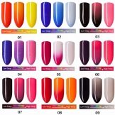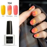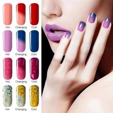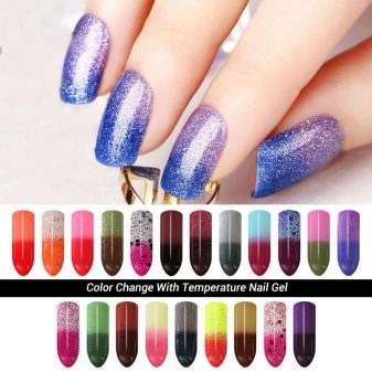 De mest almindelige er "kamæleoner" af den første type. Farveændringen i sådan gelpolering forekommer, når temperaturen stiger til 25-30 grader - en lys skygge vises. Med et markant fald i temperaturen kommer en mørkere farve ind.Dette gør det muligt at bruge i manikyr ikke kun toner, der er tæt i farver (beige og lyseblå, hvid og fersken), men også absolut kontrasterende nuancer (sort med rød, hvid med violet).