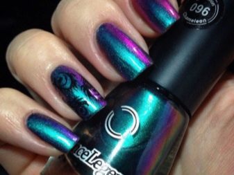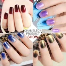 Navnet "kamæleon" antyder, at det afhængigt af pennernes forhold kan ændre farven. Sådanne faktorer kan for eksempel være temperatur, lysniveau. Gel polish ser klassisk og delikat ud om dagen og fremhæver forretningsimaget på hverdage, og om aftenen i et svagt lys bliver det spektakulært og fedt, og det ser ud som om du er på en date eller i en natklub.