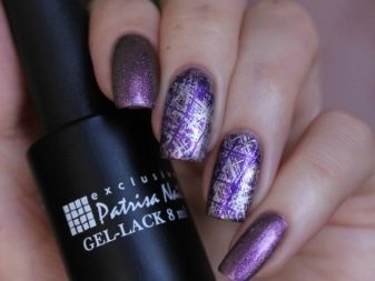 Farveskemaet ser ikke mindre stilfuldt ud, hvor dyb lilla fra Patrisa Nail og almindelig gelpolering af hvid farve kombineres. For at skabe et sådant design med en tynd manikyrbørste påføres et billede eller et mønster, og en pensel med en "kamæleon" påføres lidt højere og strækkes op. I dette tilfælde fremstilles belægningen bedst dobbelt og korrekt fastgøres med en top.