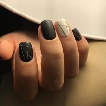 - Geometri. Hvis du kan lide geometriske mønstre, vil din manikyr også være moderigtig. Husk, at du ikke skal bruge vandrette linjer til en kort negleplade, men snarere foretrække lodrette striber, der visuelt gør neglepladen længere.Du kan lave en lignende indretning på en eller flere fingre for at indstille alle accenter.