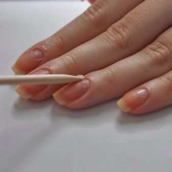 Tag en orange pind og bevæg forsigtigt neglebåndet. Skær overskydende hud af med skarp pincet. Ved hjælp af saks skal du give den ønskede form til neglepladen og bruge en neglefil for at bringe resultatet til perfektion. Negler skal kun arkiveres i en retning, så de ikke eksfolieres og ikke forringes.