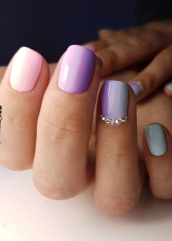 - Gradient. At skabe glatte overgange fra en farve til en anden kræver ikke meget indsats, men resultatet vil behageligt overraske dig. Negle ser stilfuld og attraktiv ud. Du kan ændre nuancer vandret eller lodret, som en særlig børste bruges til, som skygger grænsen til blomster eller en svamp. Den diagonale gradient er også på mode - når toner ændres diagonalt. Og for dem, der elsker et optøjer af farver, kan du oprette en kaotisk version, som er en lysfarvede pletter, der sømløst erstatter hinanden på den samme negleplade.