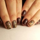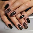 Ideer om tegninger og mønstre kan være meget forskellige. For eksempel ser indstillinger med frugt eller inskriptioner meget pæn ud. Rumtemaet er også bemærkelsesværdigt, som kan oprettes ved hjælp af forskellige nuancer af gelpolver ved hjælp af forskellige farver af mørke lakker. Trendy logomani: logoer på accentnagler kan strække selv det mest kedelige manikyrdesign.