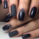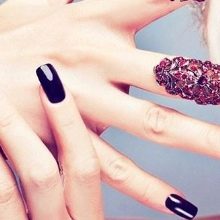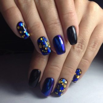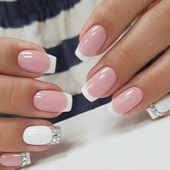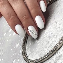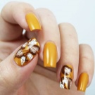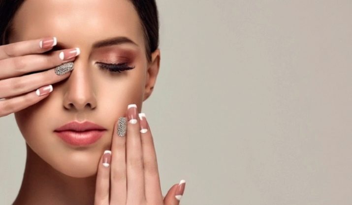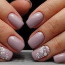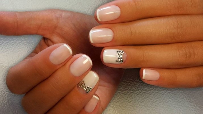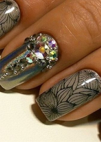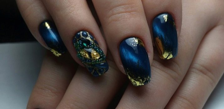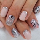 Rhinestones og sten. Tendensen med at dekorere manikyr accenter med forskellige sten og mousserende indretning har ændret sig lidt i dag. Nu er det vigtigt ikke at overdrive det med mængden af glans, fordi jo mere det er, jo billigere bliver designen. Alligevel indlagt med opaler og Swarovski-krystaller vil være passende til moderne design. Arrangementet af rhinestones skal dog være punktlignende, det er sådan, de vil se organisk ud i designet.