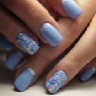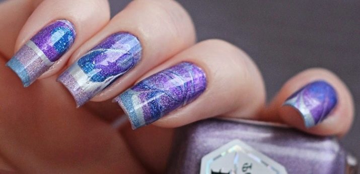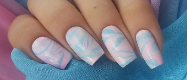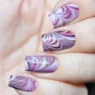 Vand design bruges til at dekorere accent negle kombineret manikyr. Teknikken er ret interessant og har brug for en foreløbig tegning i et glas med koldt vand. Det er i et glas, at de skaber det ønskede mønster ved at dryppe skiftevis kontrasterende gelpolver ind i midten af de foregående dråber. Når de når det ønskede antal dråber, tager de en tandstikker og skaber et specifikt mønster med det, der kombinerer de kontrastfulde nuancer af gelpolver. Efter at fingeren med den påførte beskyttelse er dyppet i vand, hvorved overtrækket overføres til neglepladen.